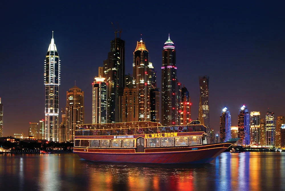 Por la noche salida para disfrutar de la experiencia de las vistas y sonidos de la cala de Dubai, navegando dos horas a bordo de un Dhow tradicional en Marina. Cena buffet incluido. Regreso al hotel. Alojamiento.
